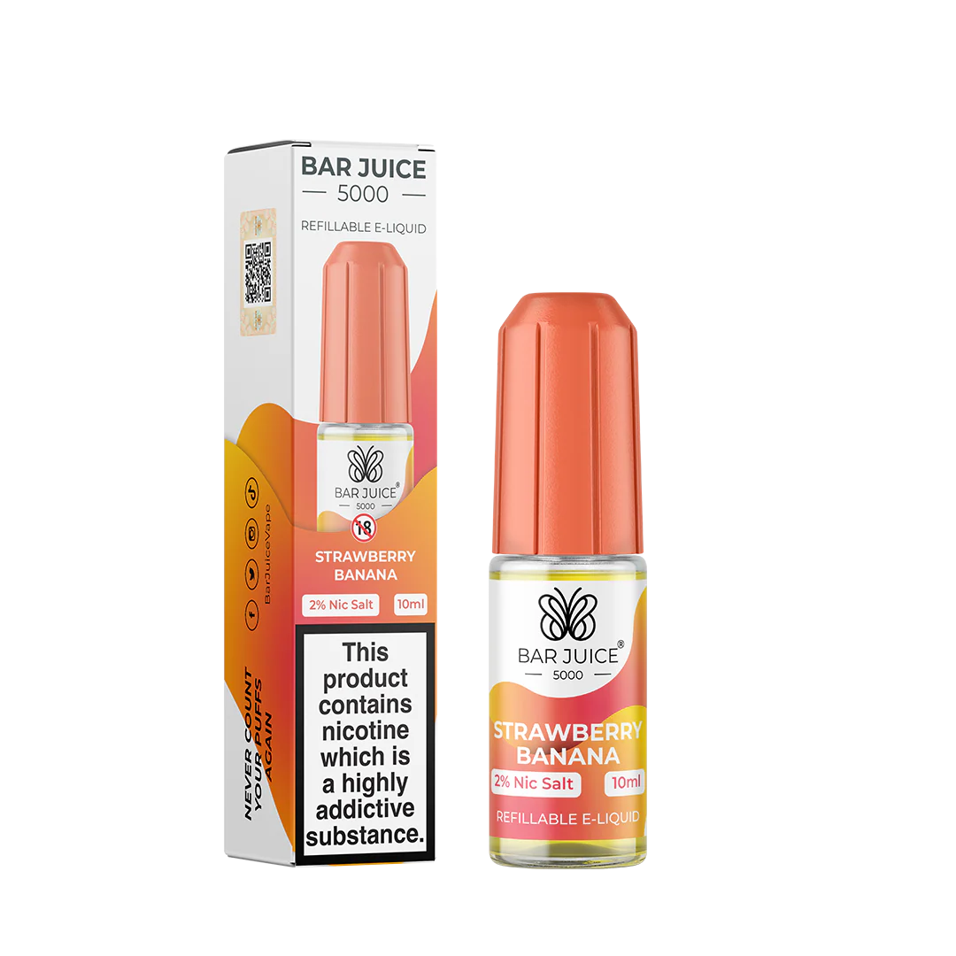 Strawberry Banana Indulge your senses with Bar Juice 5000 Strawberry Banana - ripe strawberry and mellow banana swirl together for a tropical fruit smoothie in vape form. Creamy, sweet satisfaction.